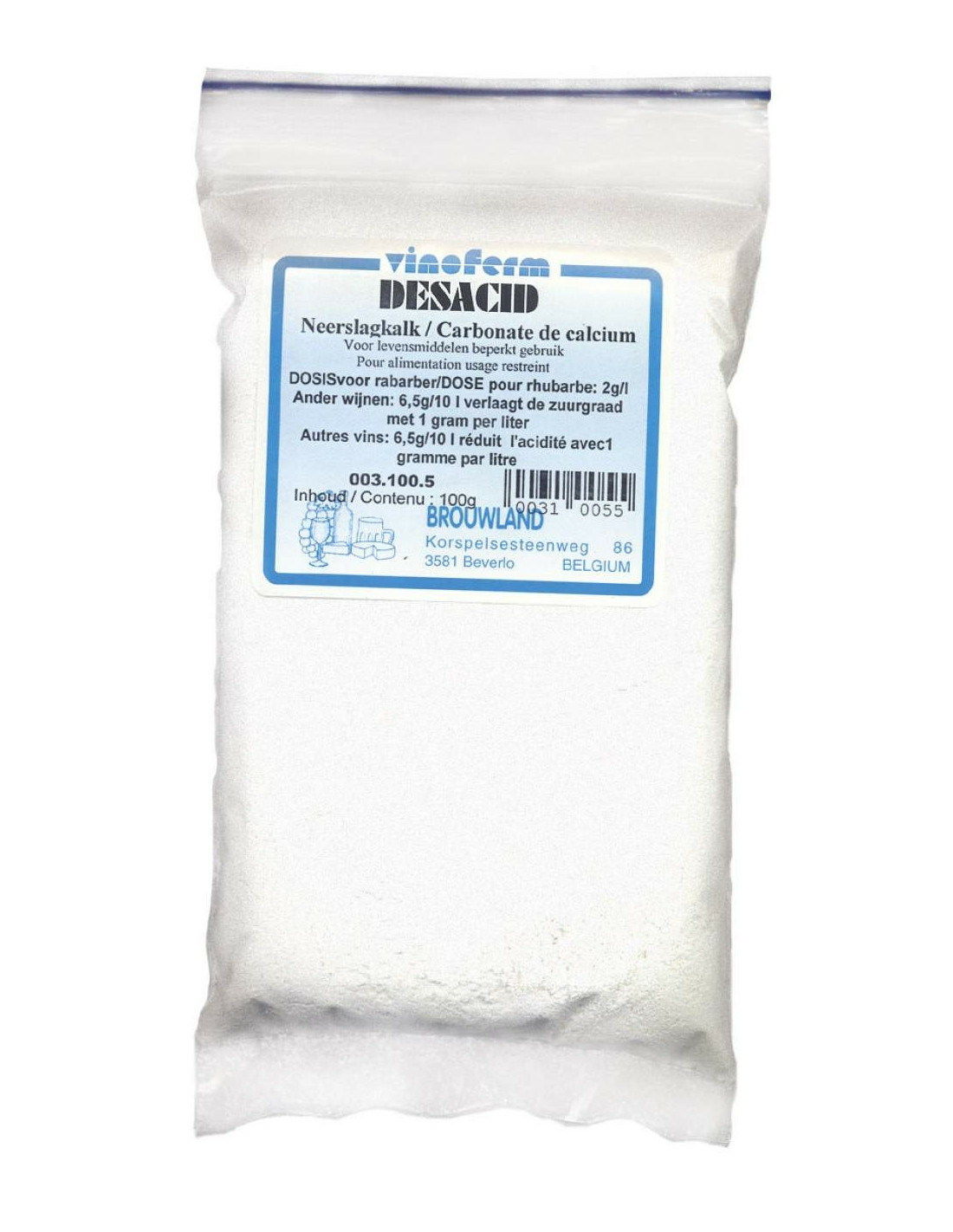 Il est conseillé de désacidifier le plus tôt possible. Le carbonate de calcium est le désacidifiant le plus souvent utilisé. Souvent beaucoup de mousse se forme pendant la désacidification. Pour cela utilisez un récipient assez grand. Ajoutez la quantité nécessaire de désacidifiant au moût, remuez pendant quelques minutes et laissez agir un peu. Ensuite remuez et laissez agir à nouveau. Répétez ceci quelques fois jusqu’au moment où il n’y a plus de formation de CO2 (plus de bruit de gaz). Laissez décanter pendant 12-24 heures. Transvasez maintenant le moût/vin sans le résidu au fond du récipient.