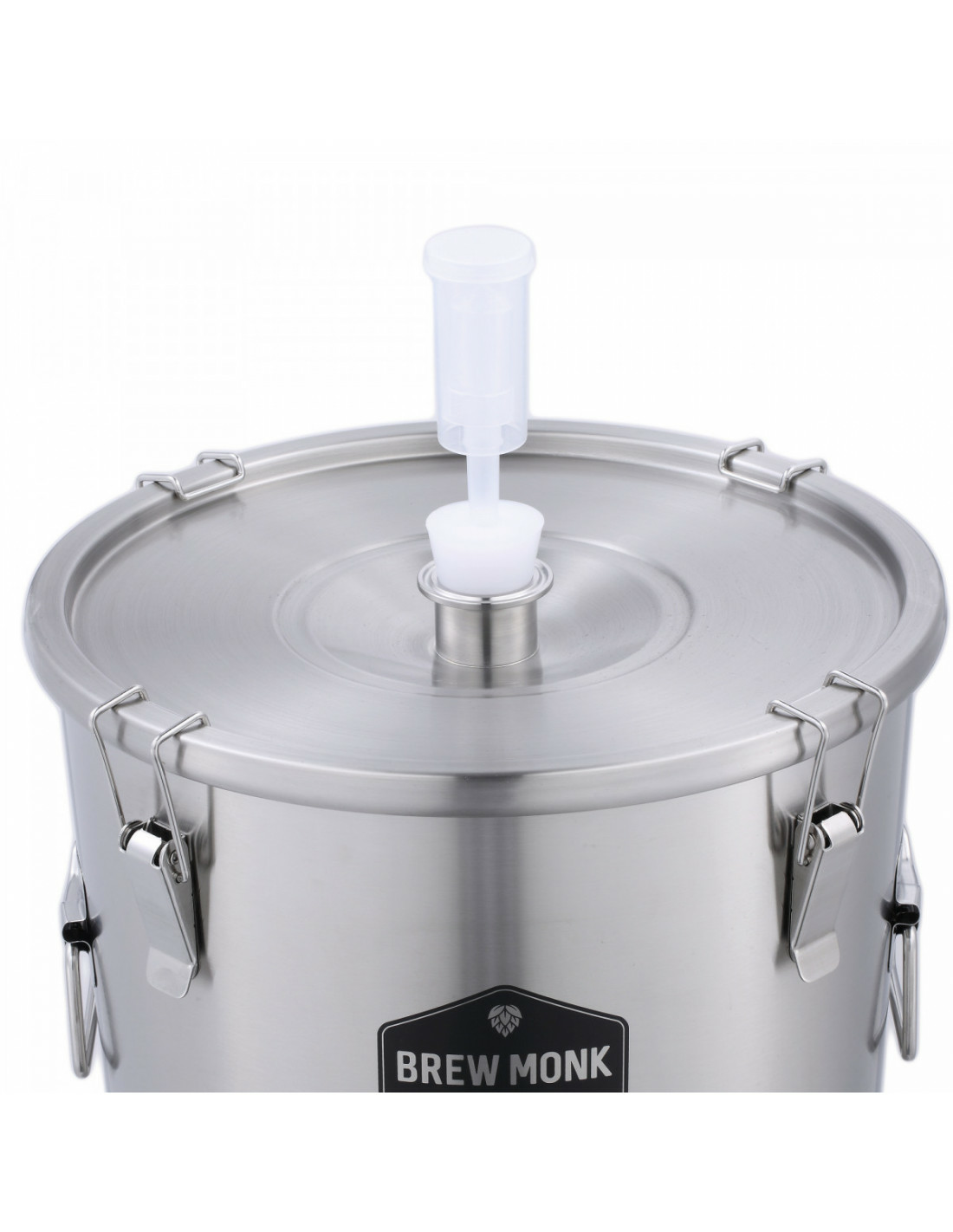 - couvercle en acier inoxydable avec joint en silicone et raccord tri-clamp 1,5″, équipé d’un bouchon en silicone avec barboteur