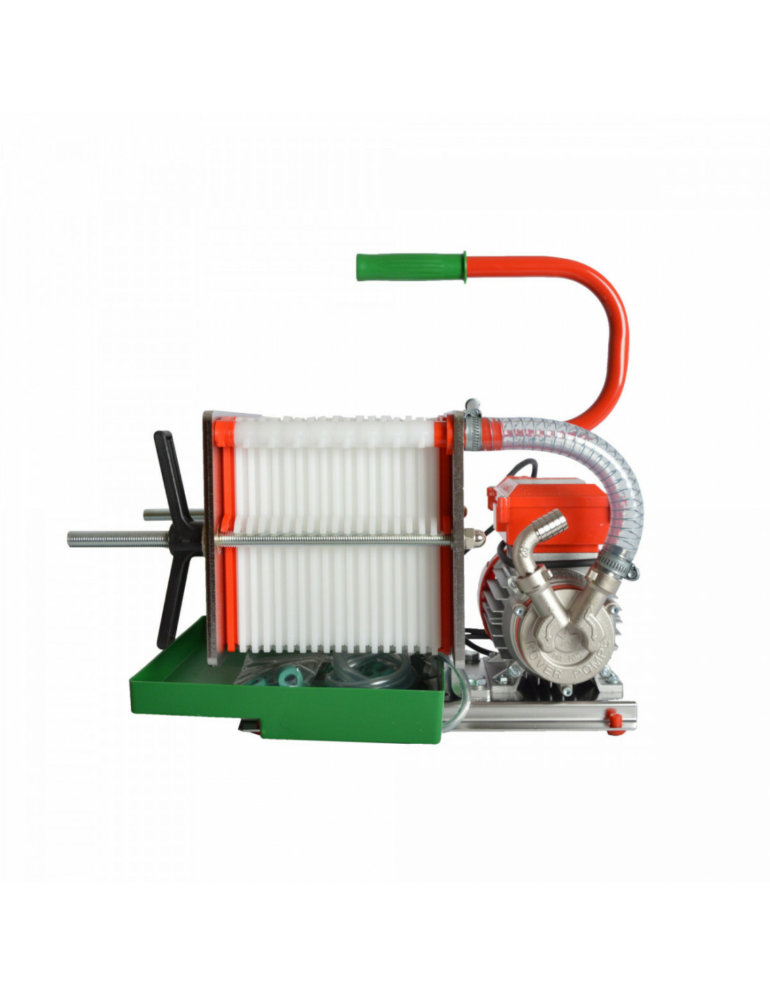 Nouveau filtre à plaques avec pompe électrique à prix avantageux. Modèle de table astucieux avec manivelle et bac récepteur. Pompe sans bypass. La pompe peut être utilisée séparément.
