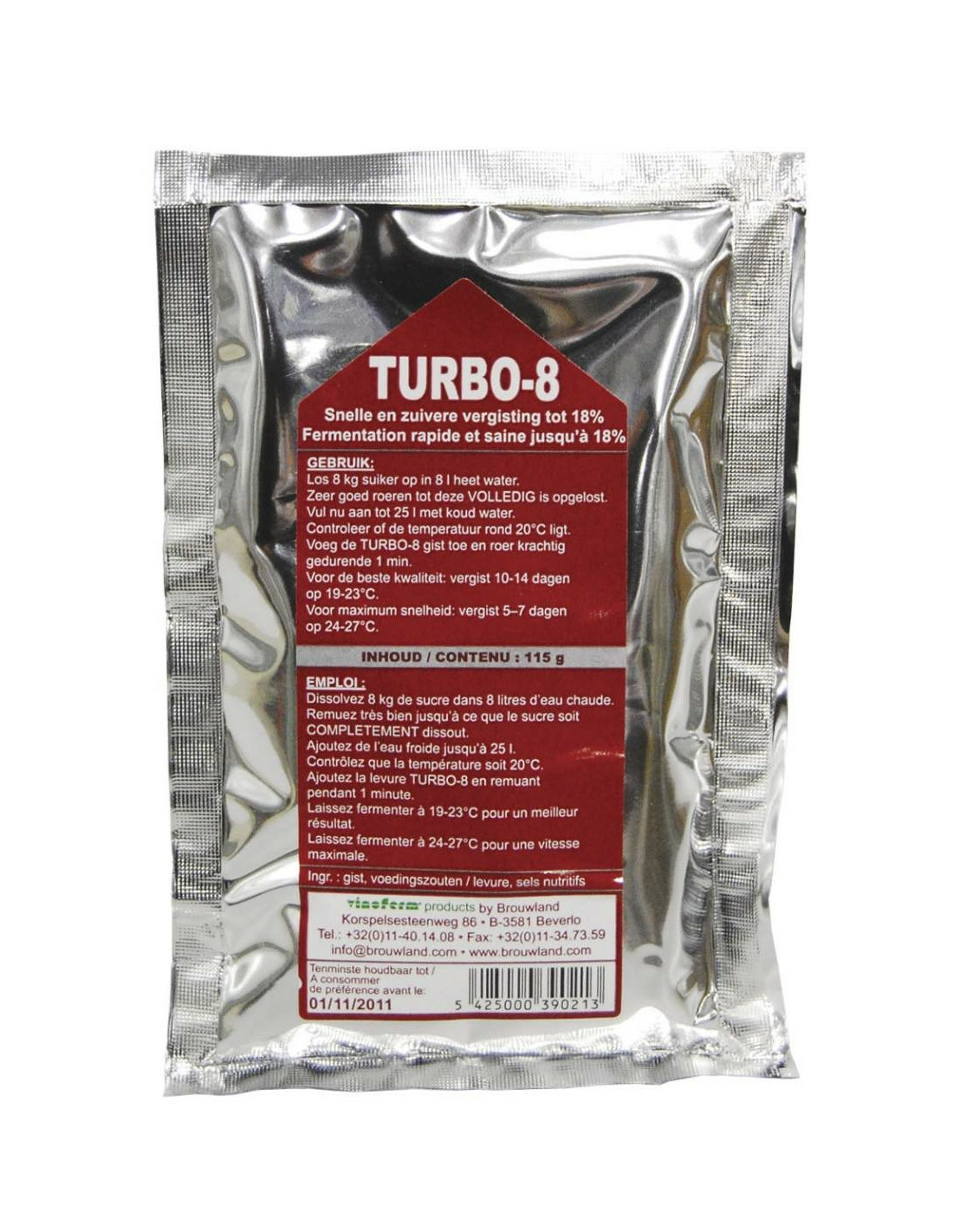 Mélange complet avec de la levure spéciale et des sels nutritifs pour fermenter 25 litres d´eau + 8kg de sucre en 5 jours jusqu´à 18%vol. Pour un produit final pur avec peu de formation en produits secondaires. L´idéal pour les liquoristes. Ne peut pas être utilisé « accumulé » (p.e. 10 sachets dans 250l de moût) à moins d´un contrôle de température et de refroidissement rigoureux.