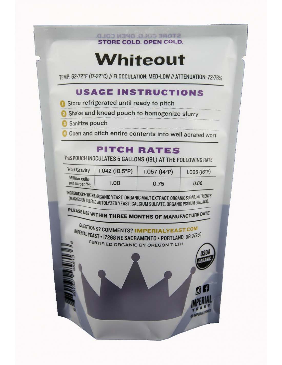 Whiteout produit un excellent équilibre entre le caractère phénolique épicé et les esters. En plus des arômes nécessaires, cette souche produit une quantité importante d’acidité, ce qui est parfait pour les wits et autres ales belges de couleur claire.