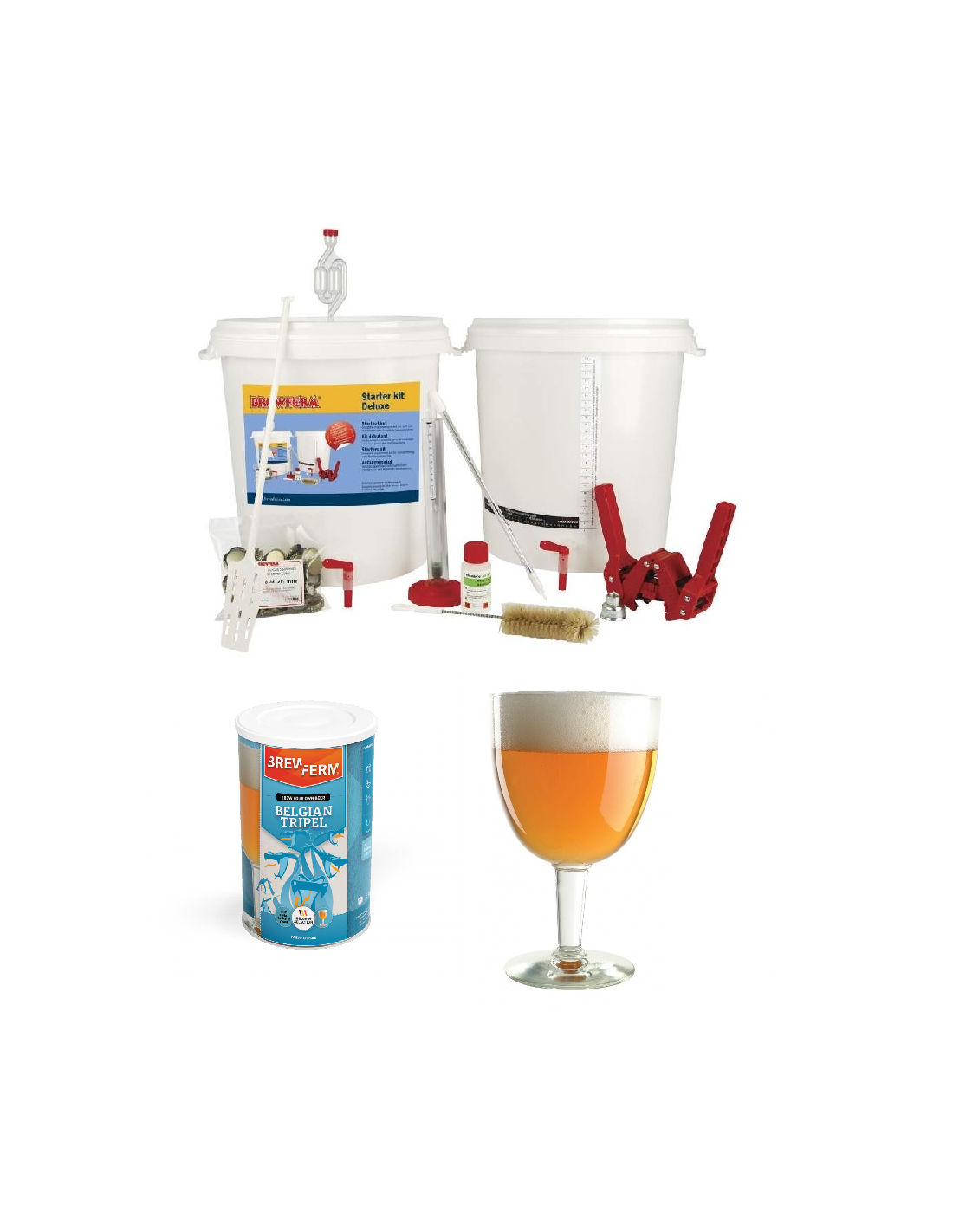 En vous procurant ce Kit débutant Deluxe Brewferm très complet vous possèderez tous les matériaux et ingrédients nécessaires pour brasser 9 litres de bière triple.
