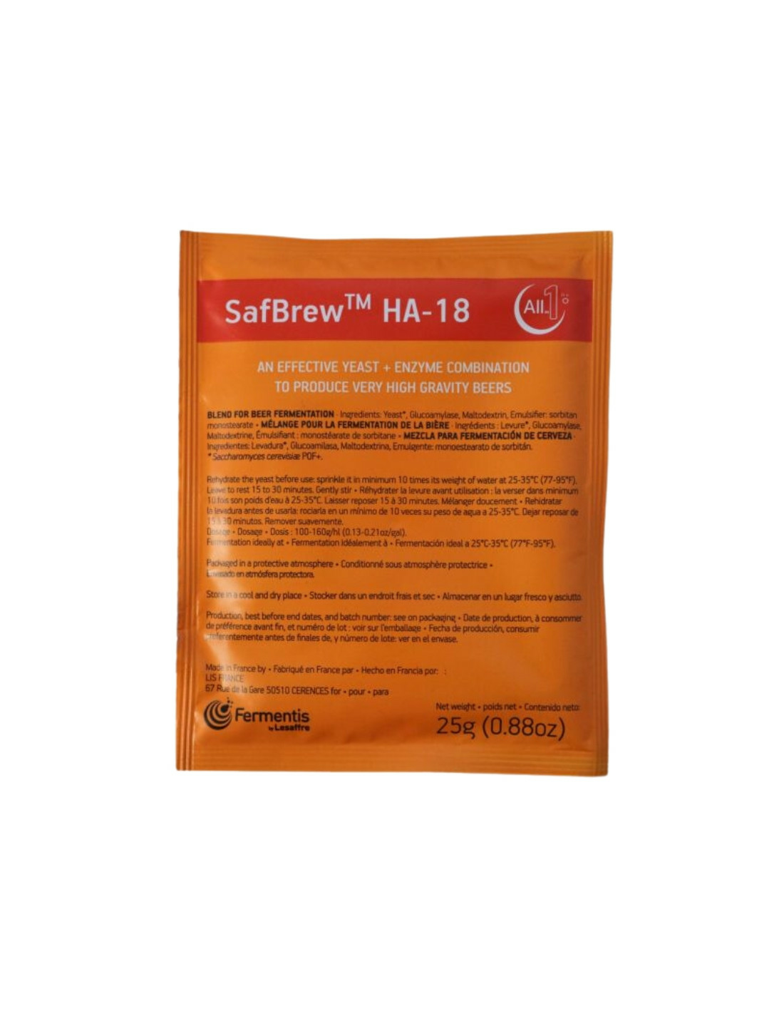 La SafBrew™ HA-18 est une solution puissante (qui se compose de levure sèche active POF+ et d’enzymes) pour la production de bières à très haute densité et très alcoolisées -comme les Strong Ales, les Barley Wines et les bières vieillies en fût ayant une très haute densité. Elle a une très bonne résistance à la pression osmotique et à la fermentation à hautes températures (levure thermotolérante).