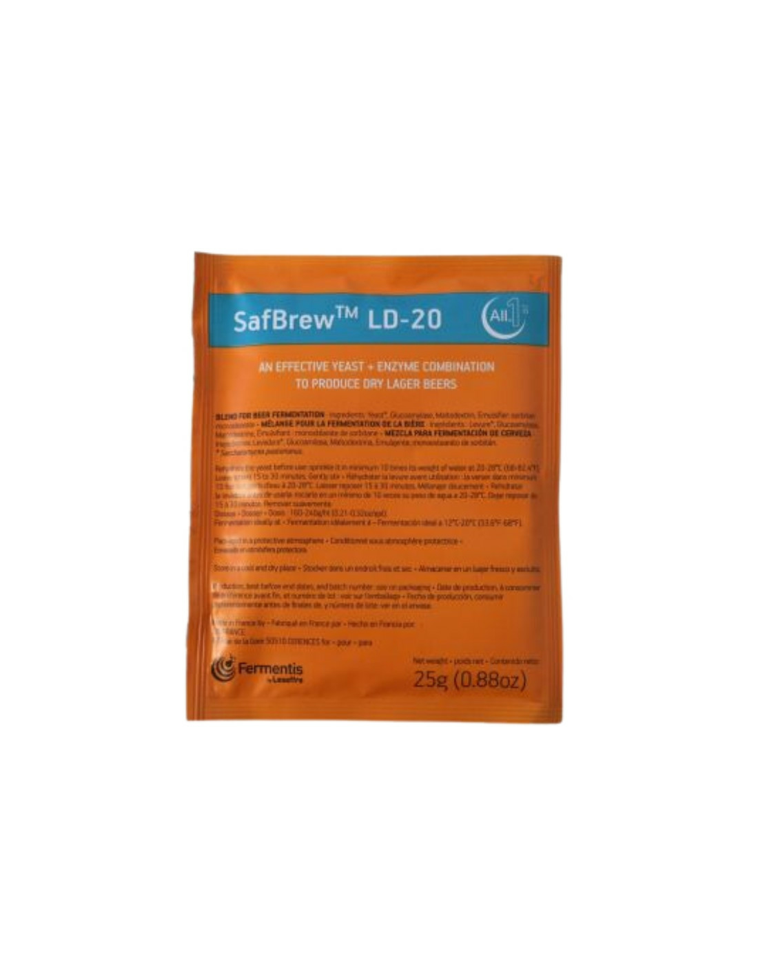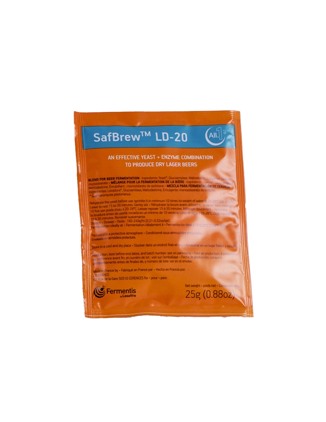 SafBrew™ LD-20 est le choix idéal pour la production de bières blondes très sèches et neutres avec des sucres résiduels réduits. SafBrew™ LD-20 est composé à la fois de levure sèche active et d’enzymes et permet la production de bières contenant le même taux d’alcool avec une réduction jusqu’à 20 % des glucides dont les dextrines.